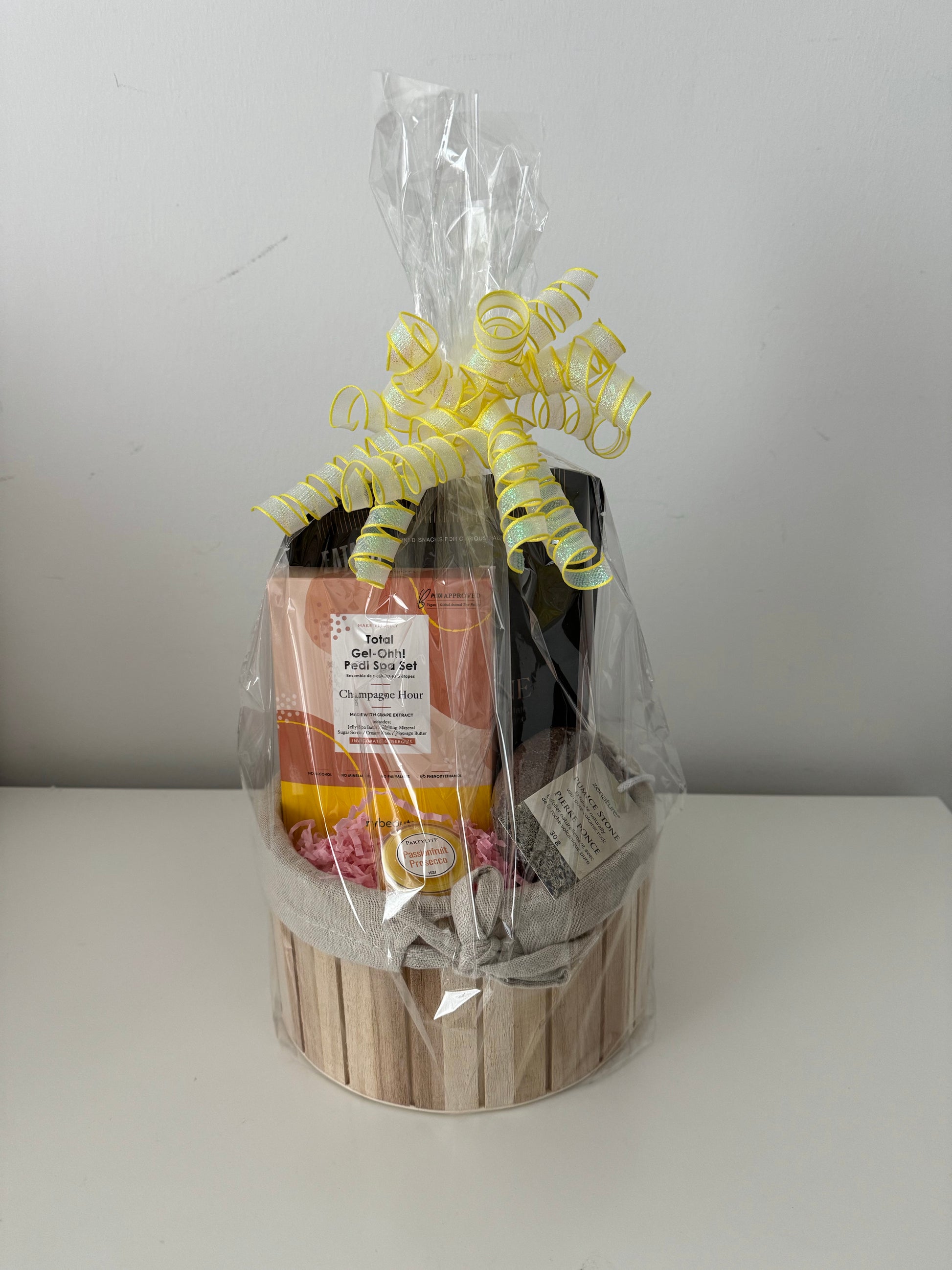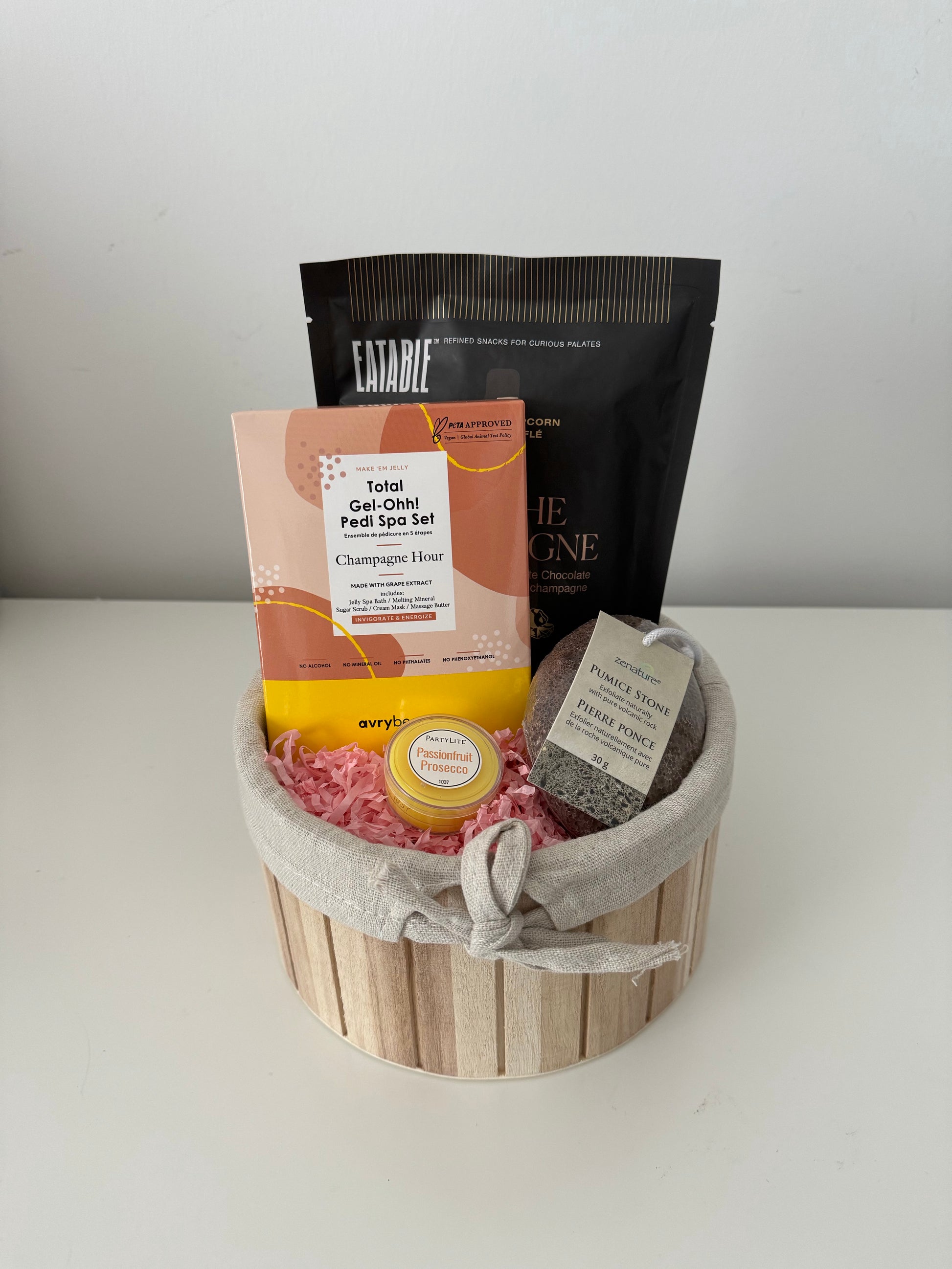 Enjoy a bubbly good relaxing moment. Includes delicious Eatable Pop the Champagne popcorn, Avry Champagne Hour pedi kit, Soak luxury soap, Natural Lava Pumice stone and a Partylite Passionfruit Prosecco tealight candle.