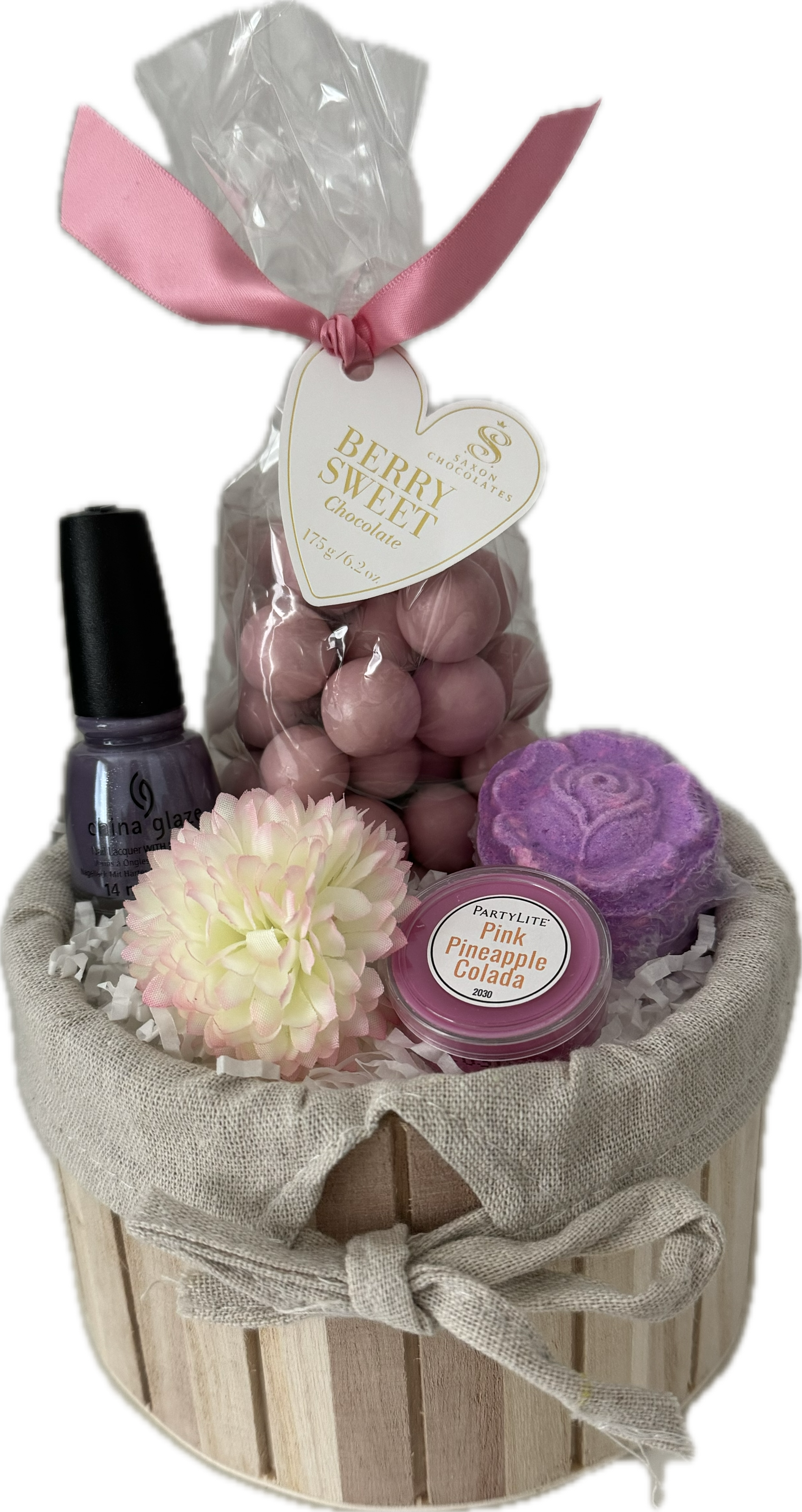 Treat Mom this Mother’s Day with this lovely little basket of treats. Sweet Chocolate Pretzel Drops. Lavender Bath Bomb, China Glaze Nail Polish and a Partylite Pink Pinneapple Colada Tealight Candle.