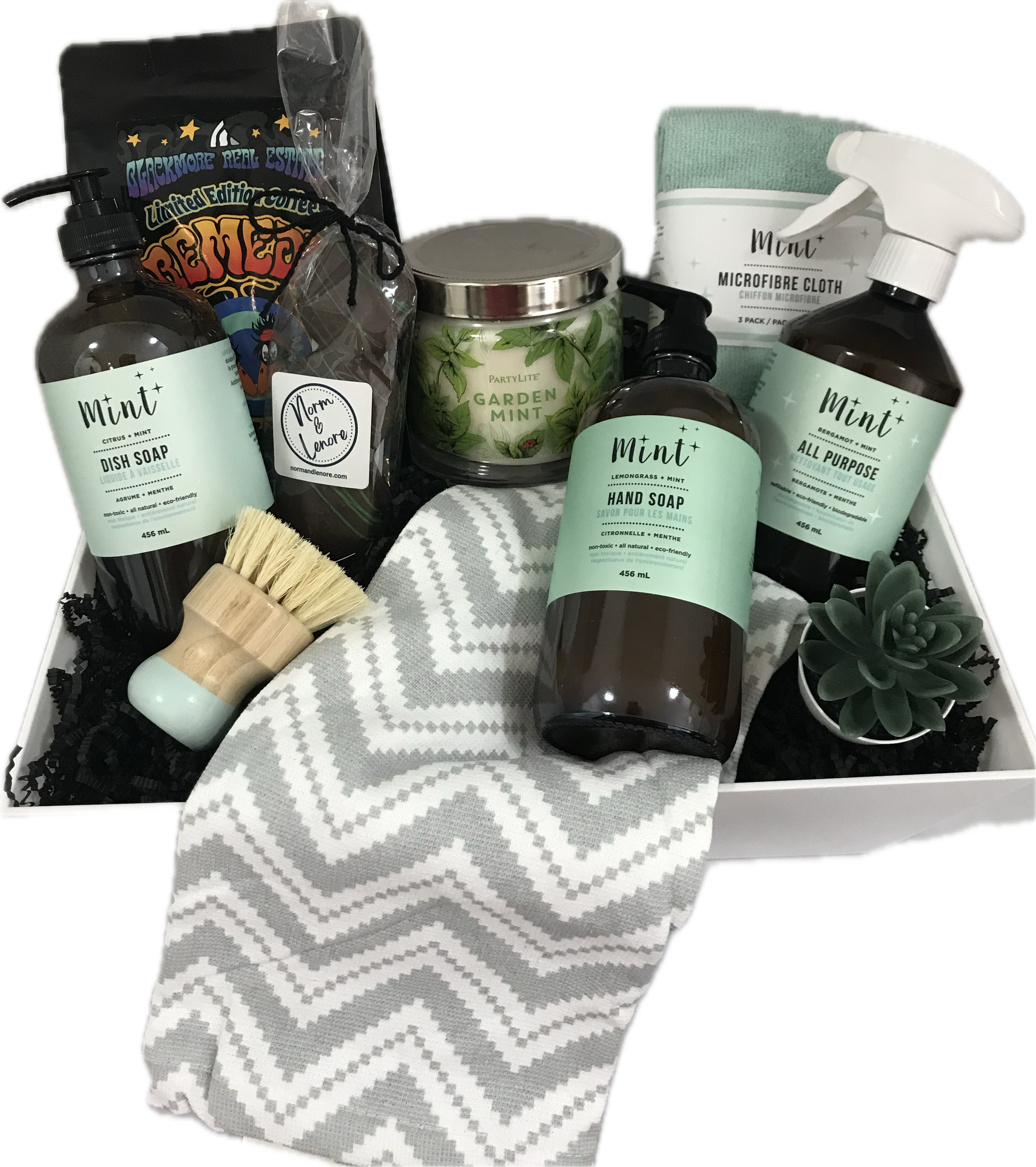 Help you clients freshen up their new home. Includes Eco Friendly Mint Products- Dish Soap with Bamboo Scrubber, All Purpose Cleaner with Microfibre Cloths, Dish Soap, a Hand Towel, Garden Mint 3 Wick Candle,Chocolate Covered Mint Oreo Cookies, and a little succulent.