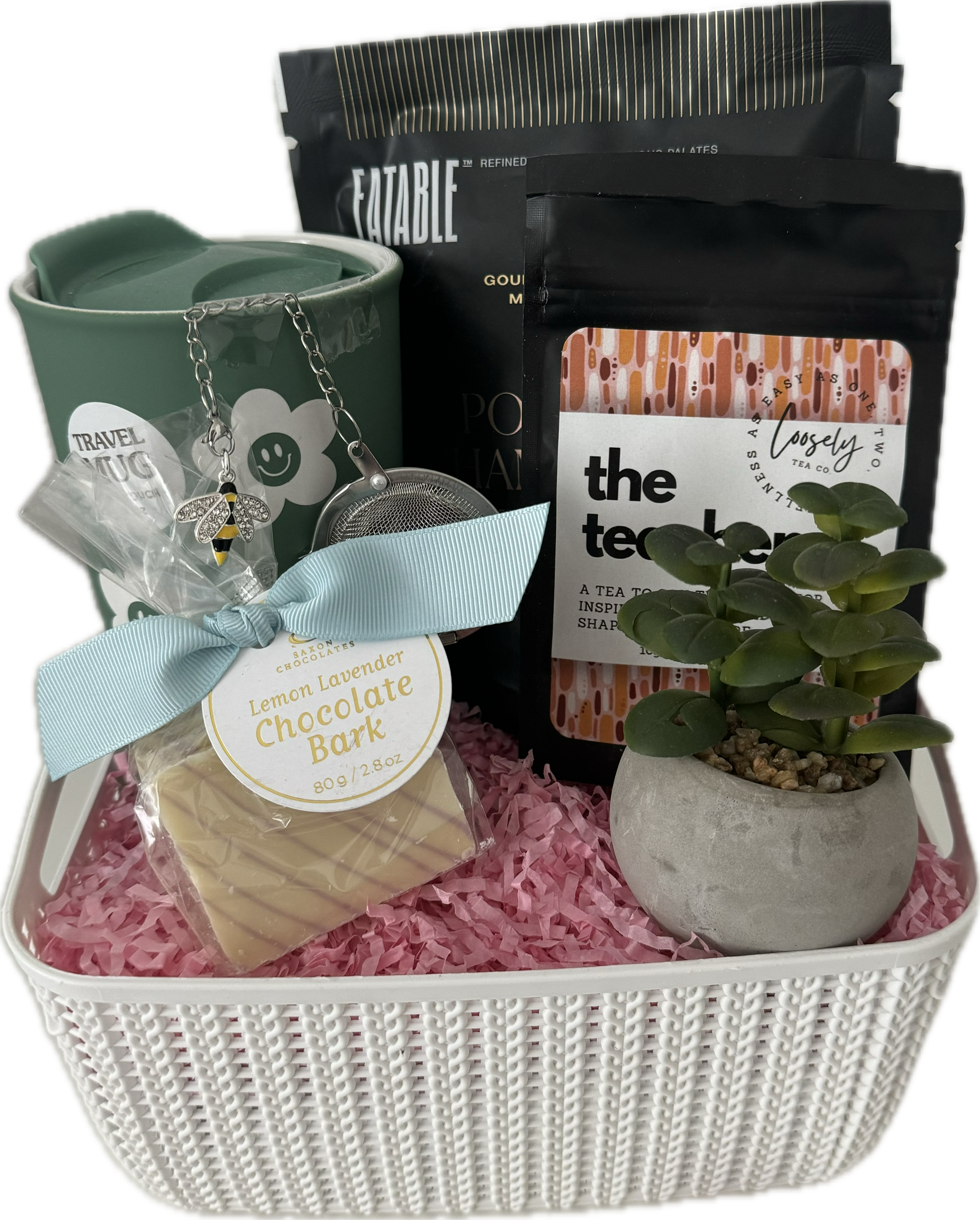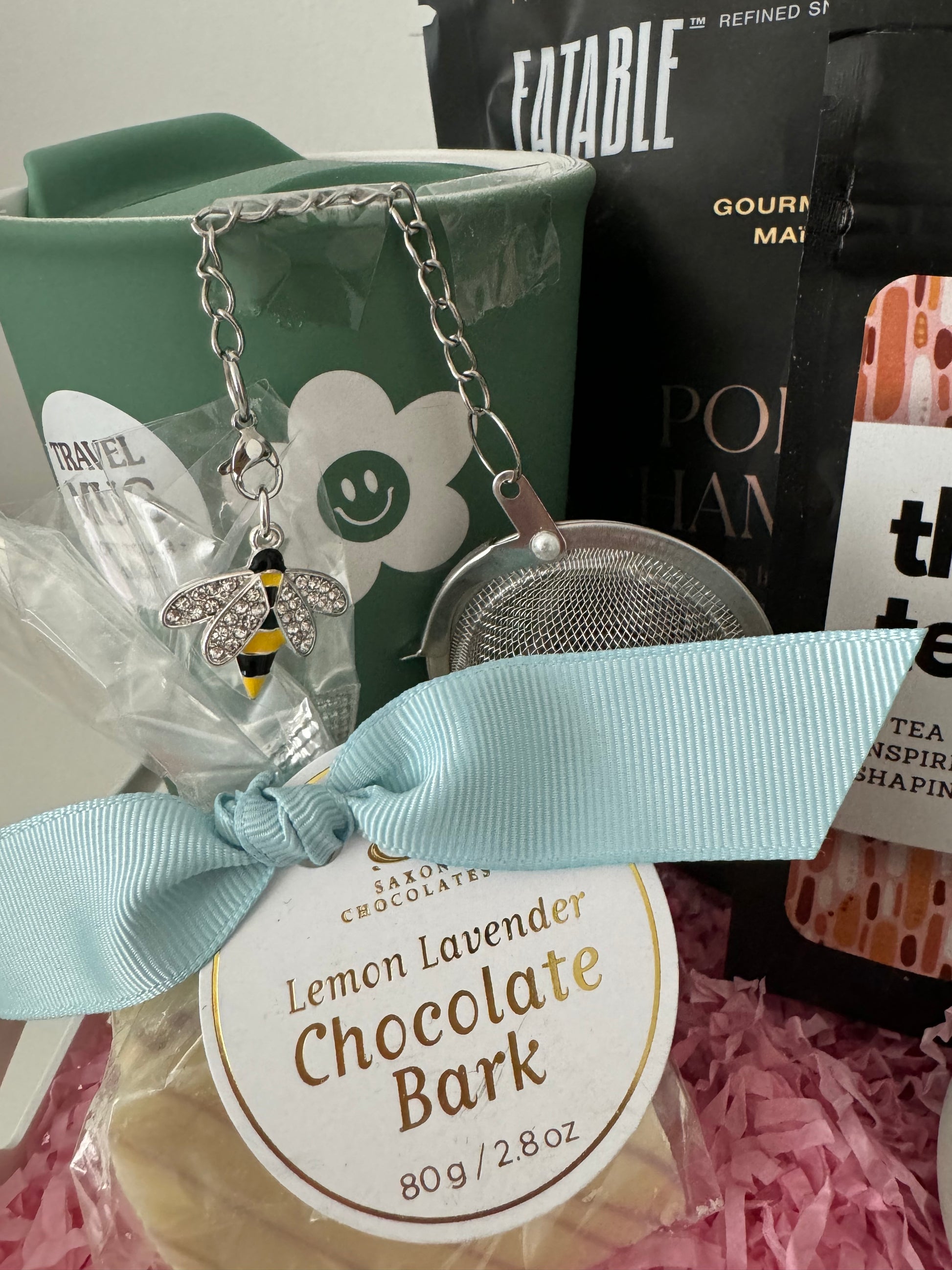 Your teacher’s will love the cute little bee in this one! Includes Eatable Pop the Champagne Popcorn, The Teacher Tea, a happy flower to go cup, a Sparkling Bee Tea Steeper, Lemon Lavender Chocolate Bark and a small succulent.